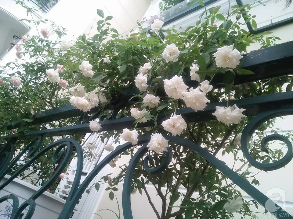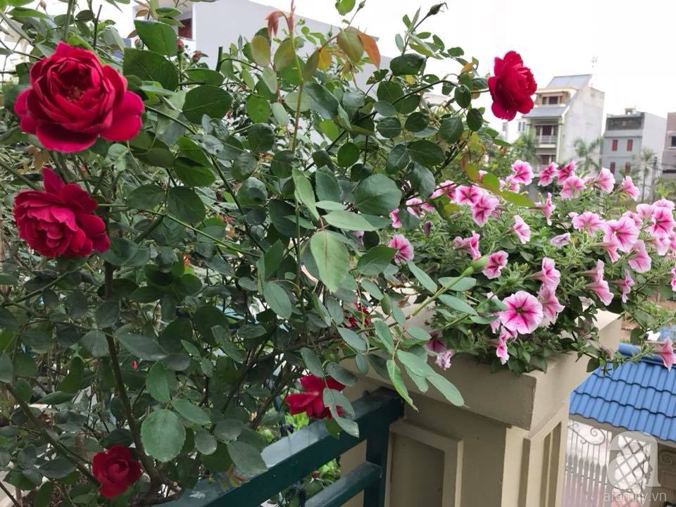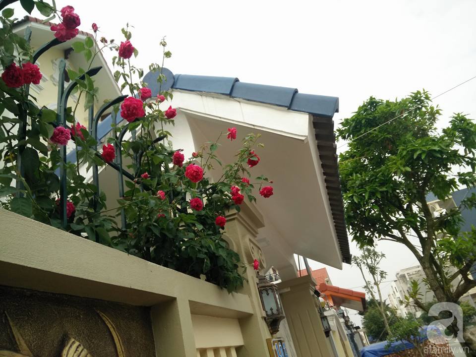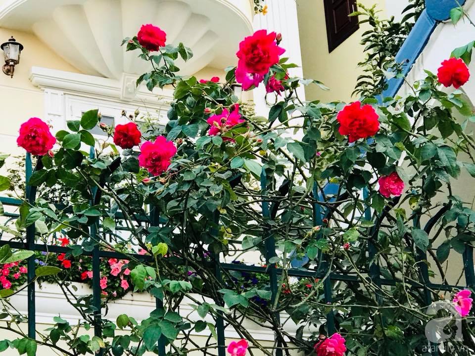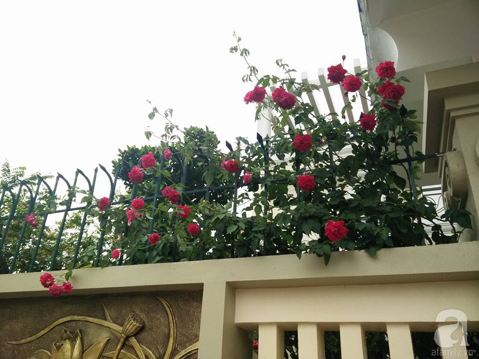 Khoảng sân trước nhà, bên hàng rào cạnh lối vào và trên ban công tầng 2 là những vị trí được chị Mai Liên ưu ái để trồng các loài hồng. Ngôi nhà của chị vì thế luôn xinh đẹp quanh năm bởi những cây hồng luôn đan xen nở rực rỡ.