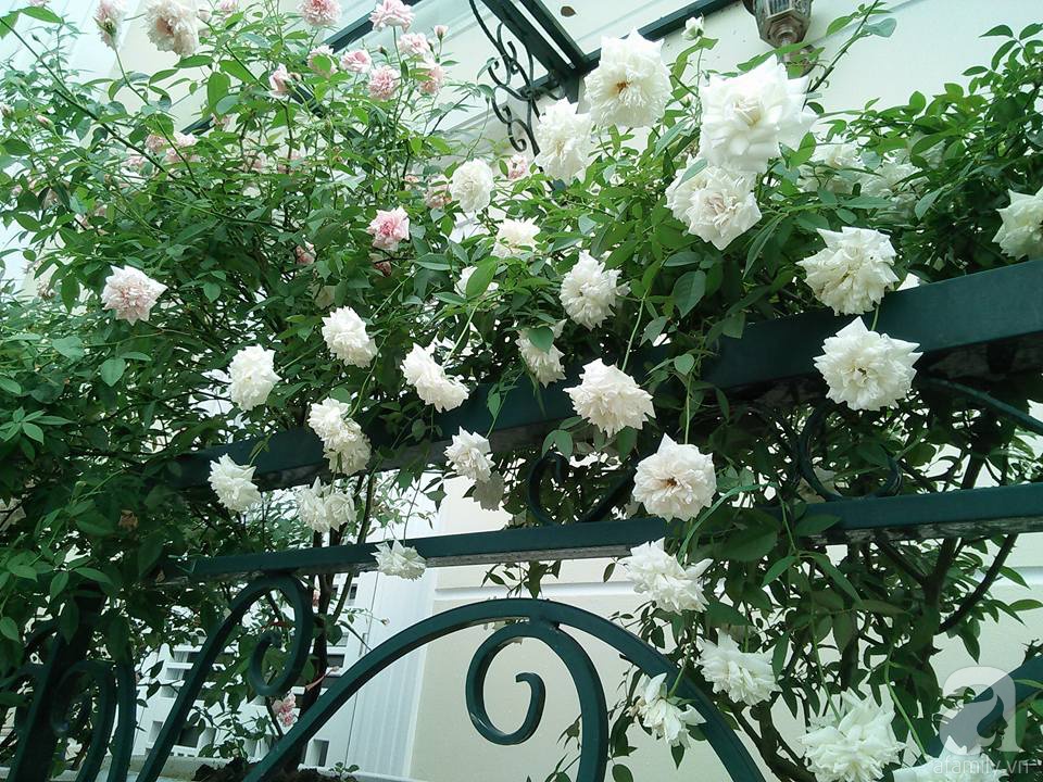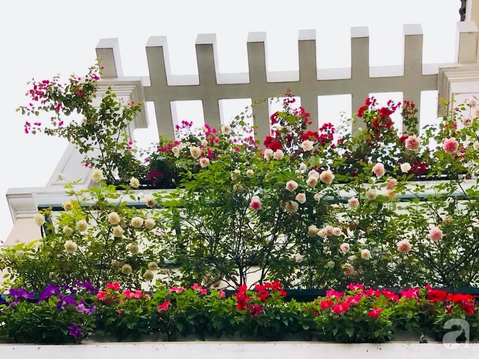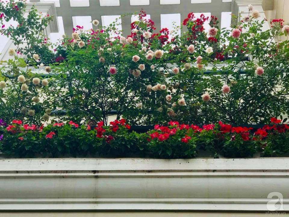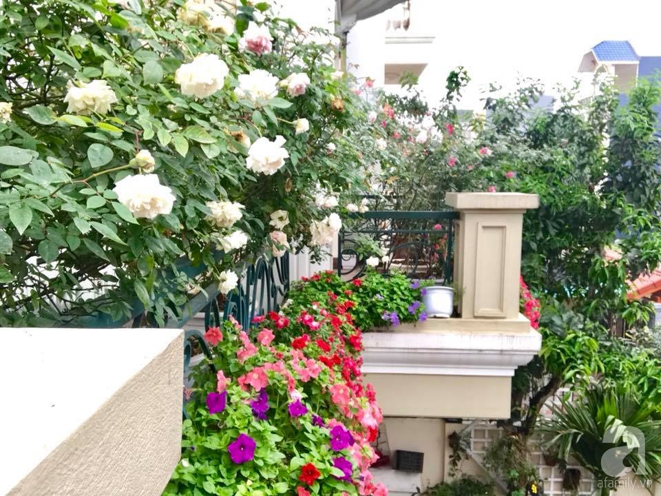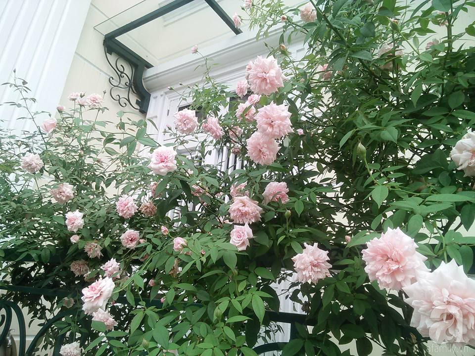 Khoảng sân trước nhà, bên hàng rào cạnh lối vào và trên ban công tầng 2 là những vị trí được chị Mai Liên ưu ái để trồng các loài hồng. Ngôi nhà của chị vì thế luôn xinh đẹp quanh năm bởi những cây hồng luôn đan xen nở rực rỡ.