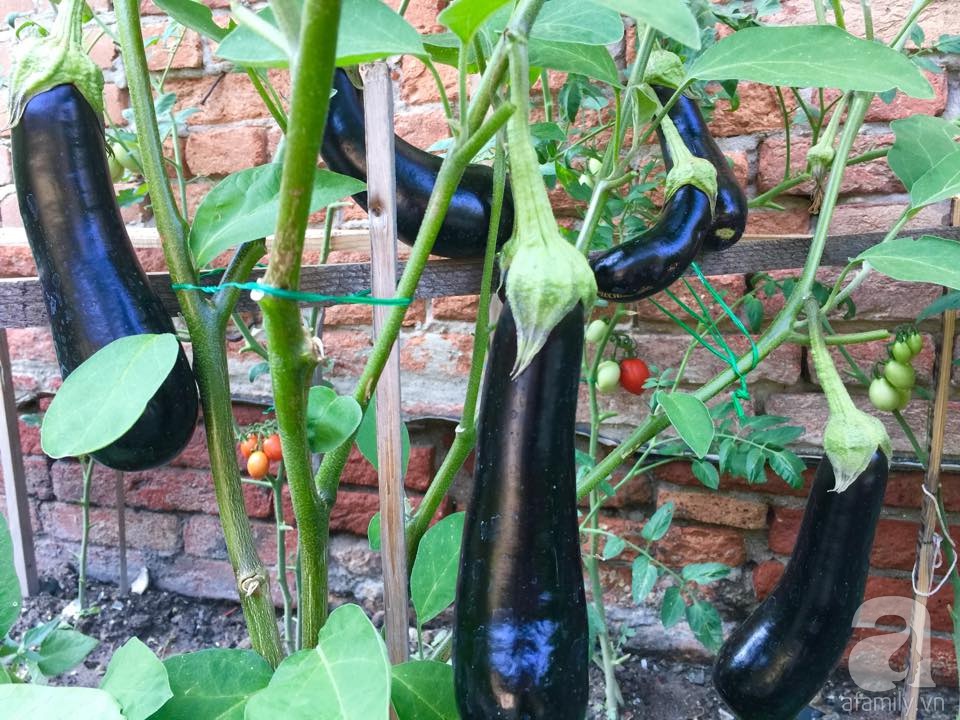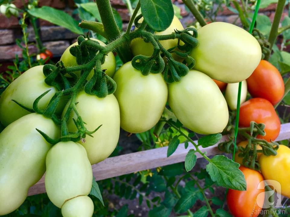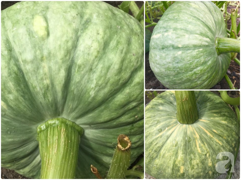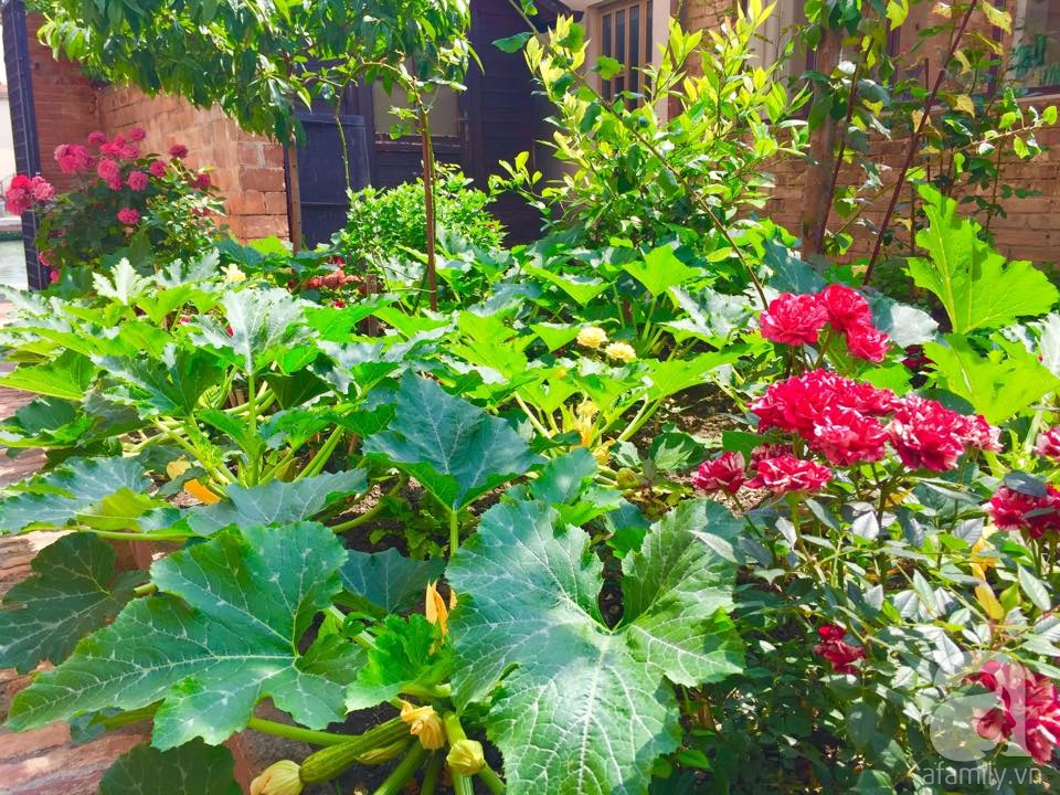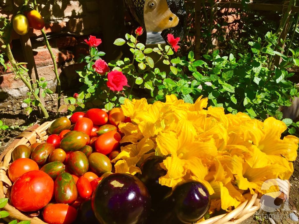 Ngoài hoa hồng, chị còn dành một phần diện tích để trồng rau quả sạch. Chị Linh cho biết, đầu tháng 4 mỗi năm, chị lại bắt đầu trồng cà chua, ớt chuông, cà tím, rau Hà Lan, đậu cove… ở các ô đất có sẵn trong sân. Bí đỏ chị Linh lại trồng trong thùng gỗ và thùng nhựa.