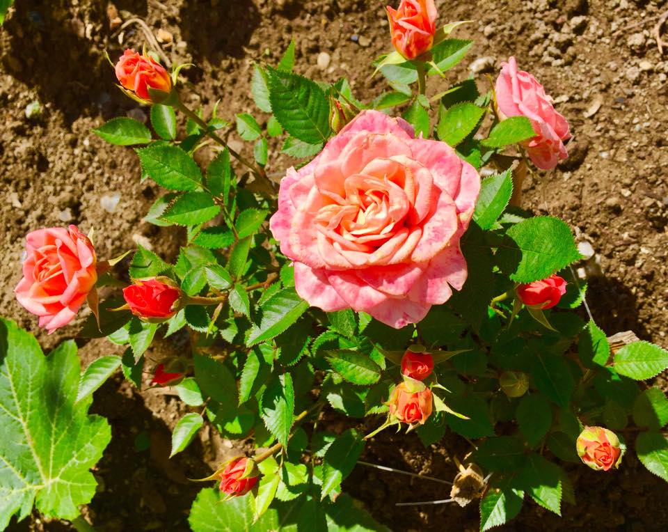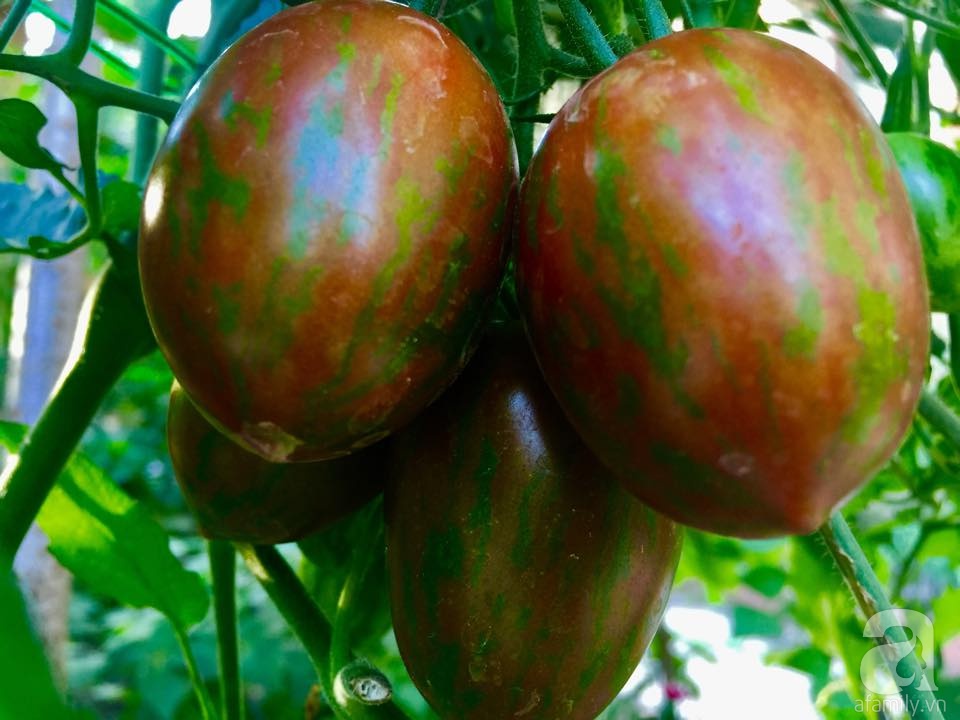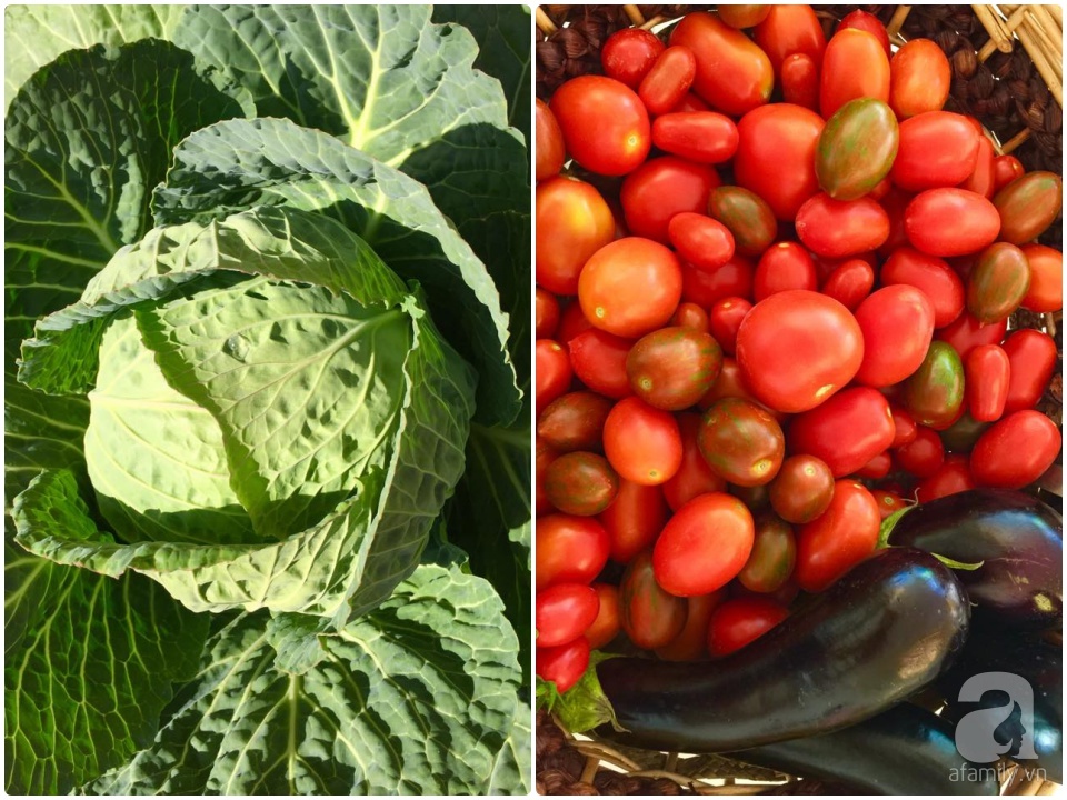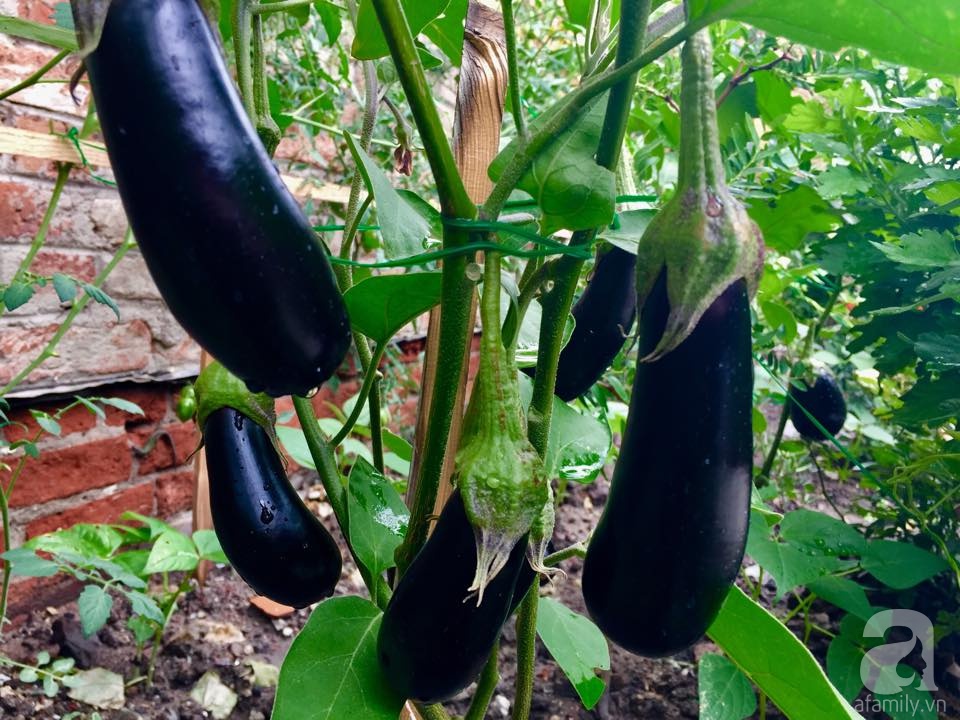 Ngoài hoa hồng, chị còn dành một phần diện tích để trồng rau quả sạch. Chị Linh cho biết, đầu tháng 4 mỗi năm, chị lại bắt đầu trồng cà chua, ớt chuông, cà tím, rau Hà Lan, đậu cove… ở các ô đất có sẵn trong sân. Bí đỏ chị Linh lại trồng trong thùng gỗ và thùng nhựa.